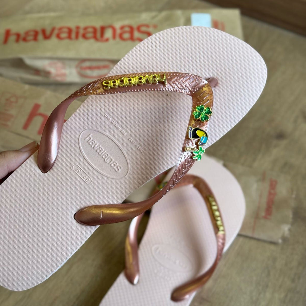 Adicione um toque de brilho e estilo brasileiro aos seus chinelos Havaianas com as novas tiras Top, placa logo e pin Tucano, Trevo, Brasil e Coqueiro. Leves e confortáveis, você vai se destacar dos demais com seu estilo exclusivo e único. Perfeito para qualquer ocasião e para se sentir chique e elegante como nunca antes.