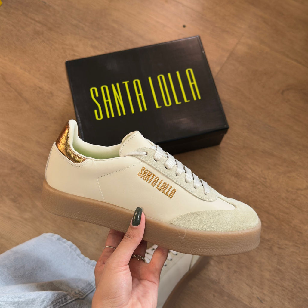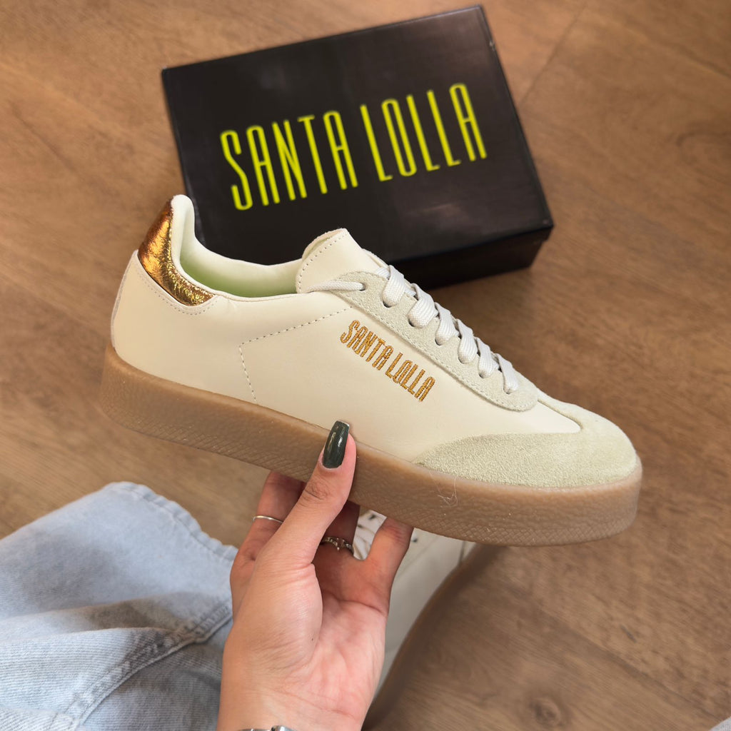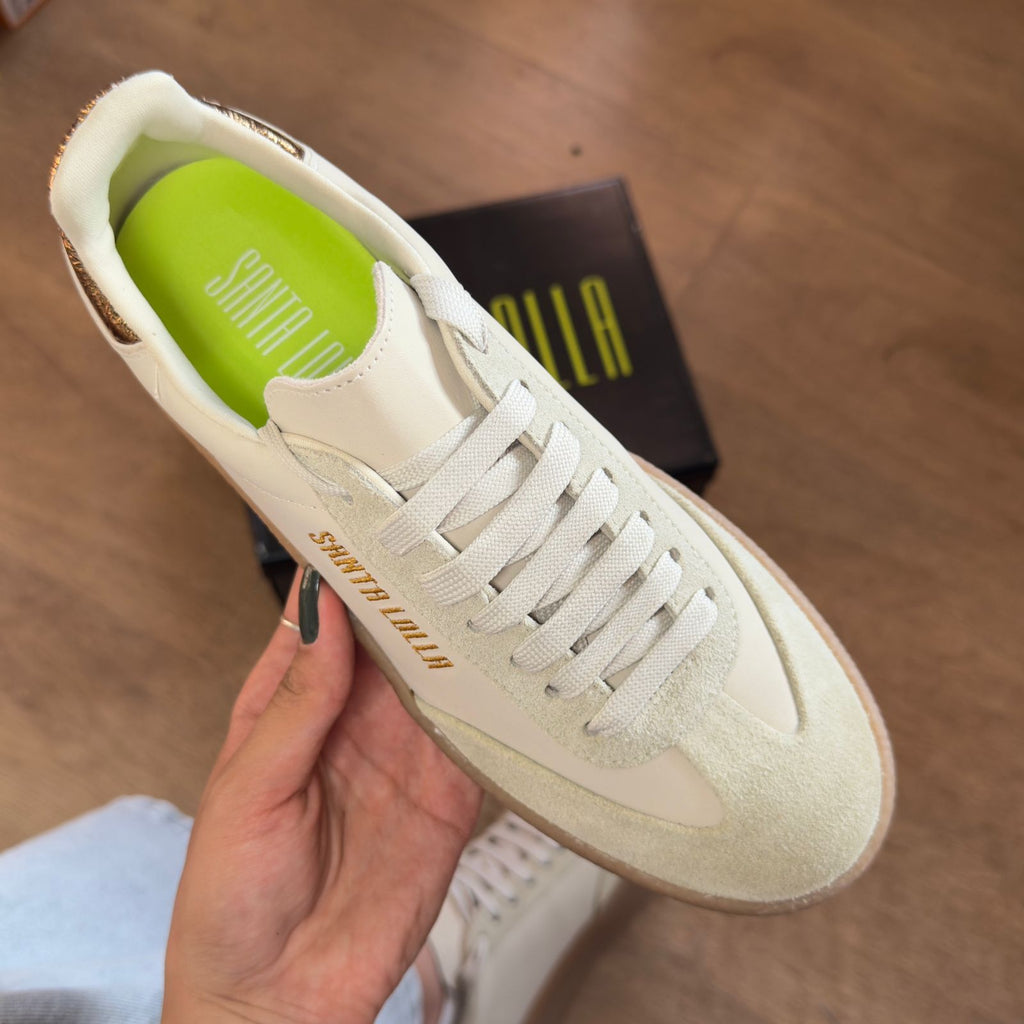 Tênis confeccionado em couro e camurça. Apresenta cabedal em couro claro com detalhes em camurça no bico e na parte superior, além de solado emborrachado que garante aderência e conforto. O nome da marca em dourado na lateral adiciona um toque sofisticado ao visual casual.