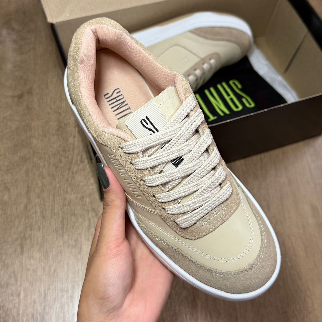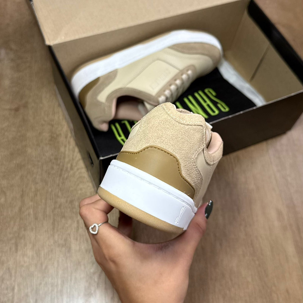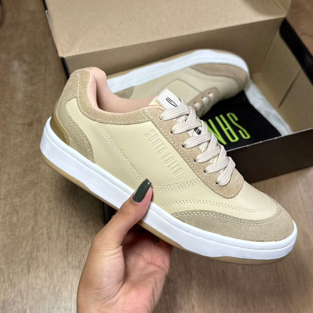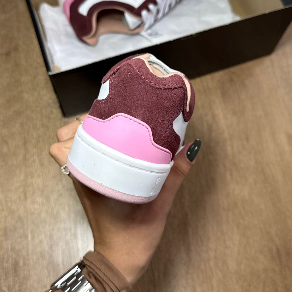 Tênis feminino confeccionado em couro camurça com design moderno, apresenta bico arredondado, solado emborrachado que garante aderência e conforto ao caminhar, além de recortes que valorizam o visual. O modelo conta com fechamento em cadarço e exibe o logo da marca em destaque, unindo estilo e praticidade para o dia a dia.