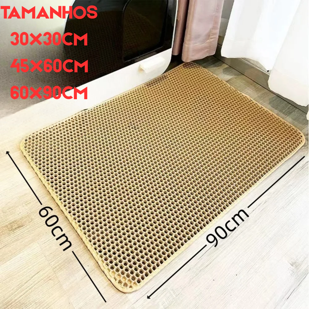 O Tapete Antiareia Premium foi desenvolvido com tecnologia de dupla camada em favo de mel que captura e retém os grãos de areia, mantendo sua casa sempre limpa e organizada – com conforto para o seu gato e praticidade para você.
