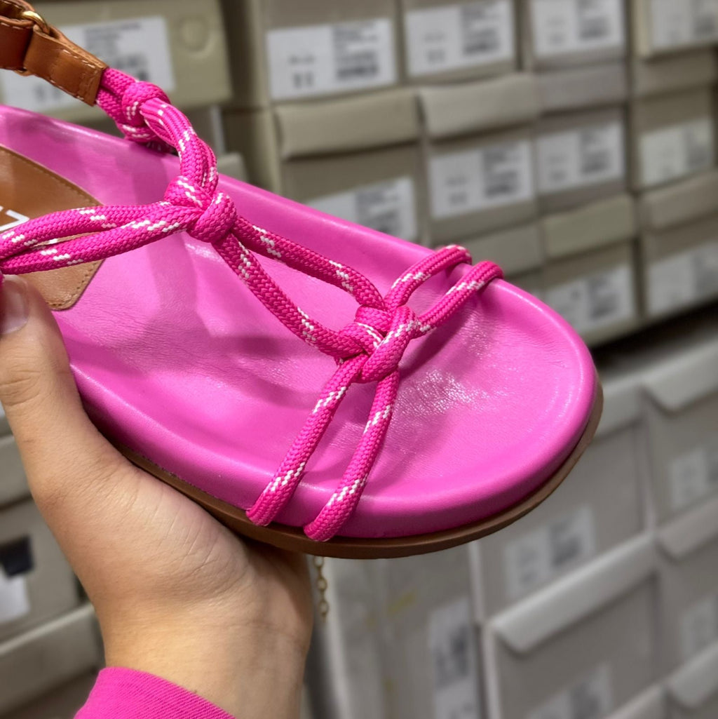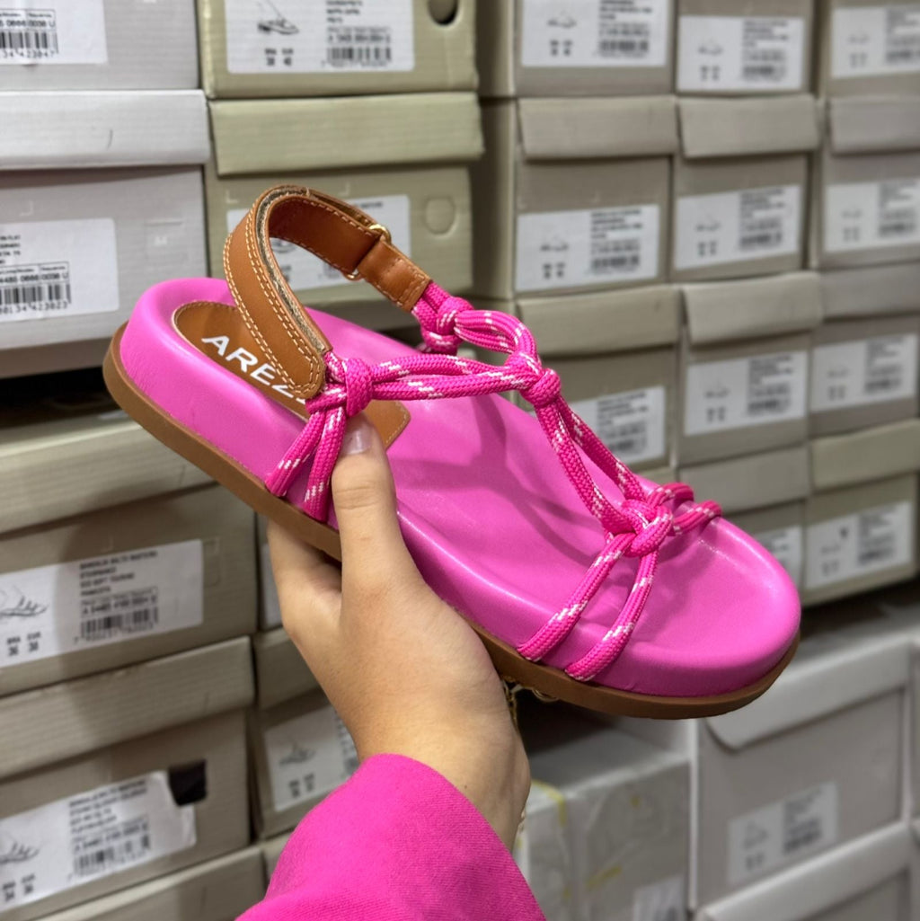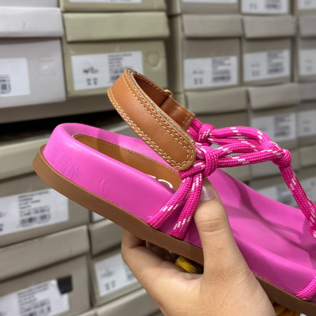 Descrição: O sapato tem salto rasteiro, palmilha com formato anatômico e inscrição do nome da marca. Possui solado flatform, base emborrachada e formato arredondado na ponta. Traz tiras em cordão, que passam sobre os dedos e na parte superior do pé, unidas por tira central com nós e nós nas laterais, conectadas ainda a tira de couro marrom no calcanhar e fechando em velcro. Acompanha um conjunto com duas tornozeleiras em cordão colorido, uma delas trançada e com pingente metálico e a outra lisa.